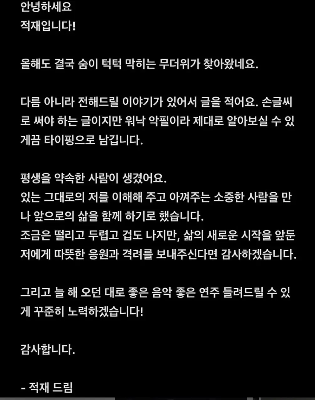 적재 씨 팬분들이라면 혹시 결혼 후 활동에 변화가 있을까 걱정하는 분들도 계실 텐데요. 전혀 걱정할 필요 없어요! 적재 씨는 결혼 후에도 "늘 해오던 대로 좋은 음악, 좋은 연주를 꾸준히 들려주겠다"라고 굳건한 약속을 했습니다. 역시 아티스트다운 멋진 마인드네요! 👍
